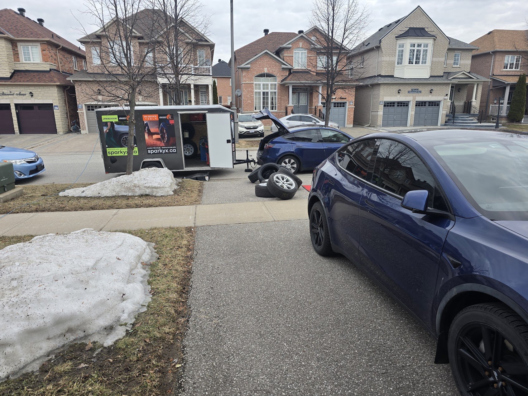 When your Tesla needs new tires mounted and balanced, Sparky X brings the shop to you. We provide Tesla mobile tire change off-rim — dismounting worn tires, mounting new ones, balancing, setting pressures, and torquing lug nuts to Tesla specs — all at your home or workplace. We serve Model 3, Model Y, Model S, Model X, and Cybertruck across Toronto, Durham, and York Region.